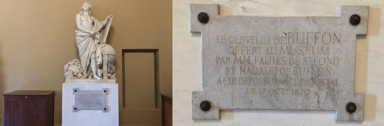 Enfin, remisée contre un mur, on admire une statue majestueuse du plus célèbre directeur du muséum, Buffon (1707-1788) sculptée par Pajou à la demande de Louis 15, avec cette devise « MAJESTATI NATURAE PAR INGENIUM » (Un génie égal à la majesté de la Nature), une plaque en marbre nous apprenant que son cervelet a été déposé ici, le 17 octobre 1870, dans le piédestal 🧠