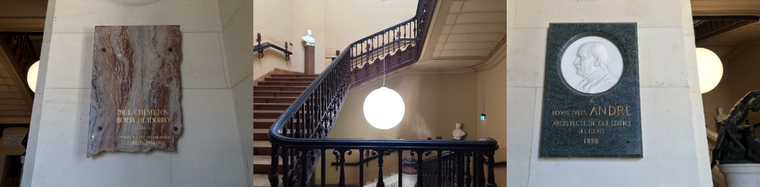Au rez-de-chaussée, outre deux statues de chasseurs à demi-nus censées représenter la domination de l’Homme (l’homme) sur l’animal et la nature, on découvre avec stupeur les caveaux de Guy de la Brosse (1586-1641), fondateur du Jardin des Plantes, et de Victor Jacquemont (1801-1832), « voyageur » du Muséum mort très jeune, des plaques, celle en hommage à Louis Jules André, architecte « de cet édifice » et une autre, étonnante, des deux auteurs de la rénovation de 1987-1994, Paul Chemetov et Borja Huidobro, ornée de la phrase suivante, sorte d’oxymore patrimonial : « Conserver c’est transformer ».